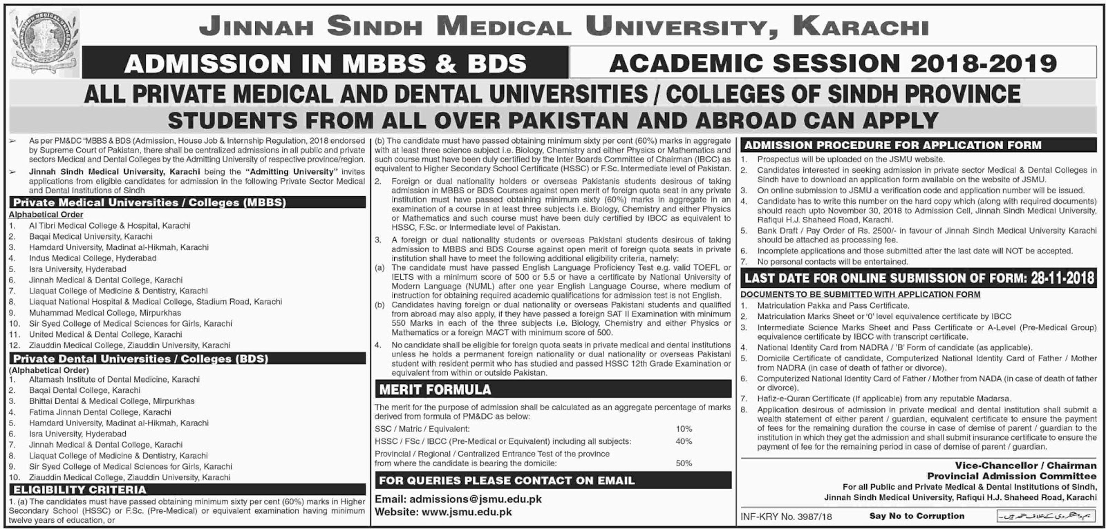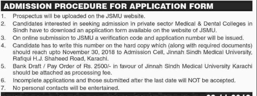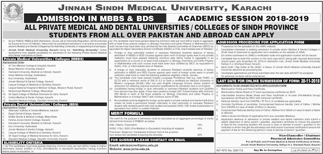JINNAH SINDH MEDICAL UNIVERSITY, KARACHI has announced the admission schedule for MBBS & BDS admissions in all private Medical & Dental colleges of SINDH Province.