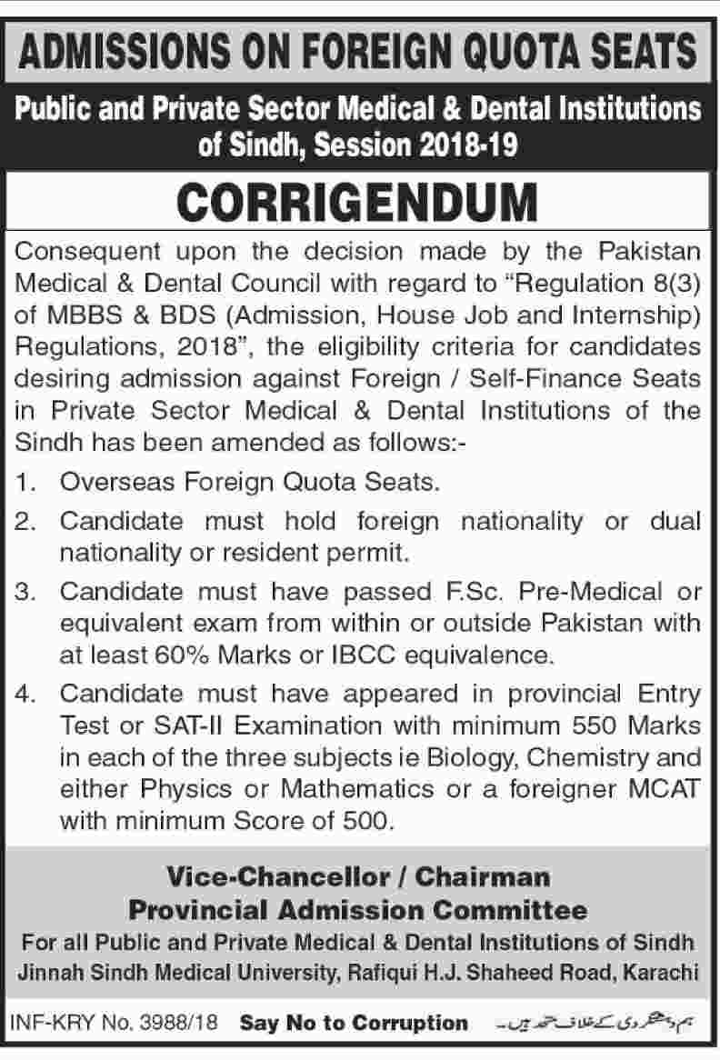Dual nationality holders can also get admission in the private medical colleges of Sindh.Following is given the notice for admission
