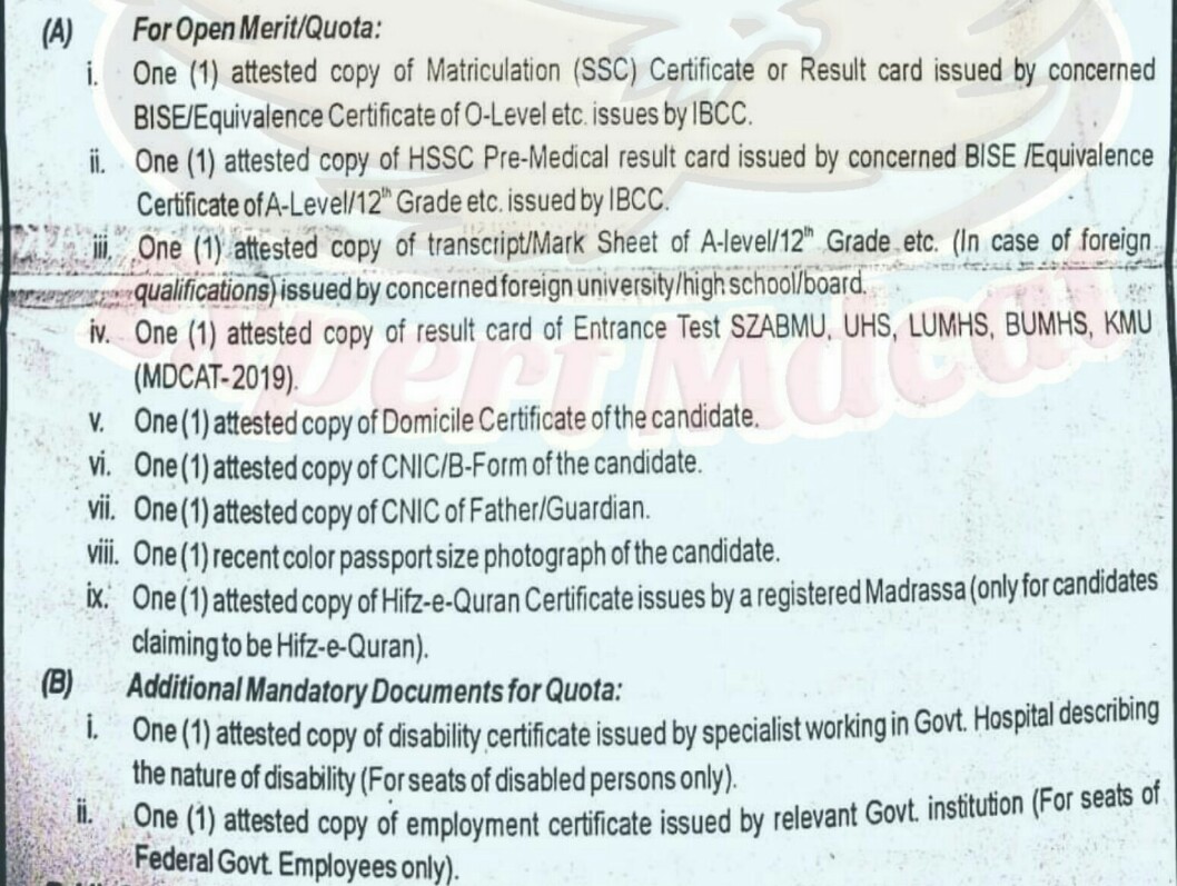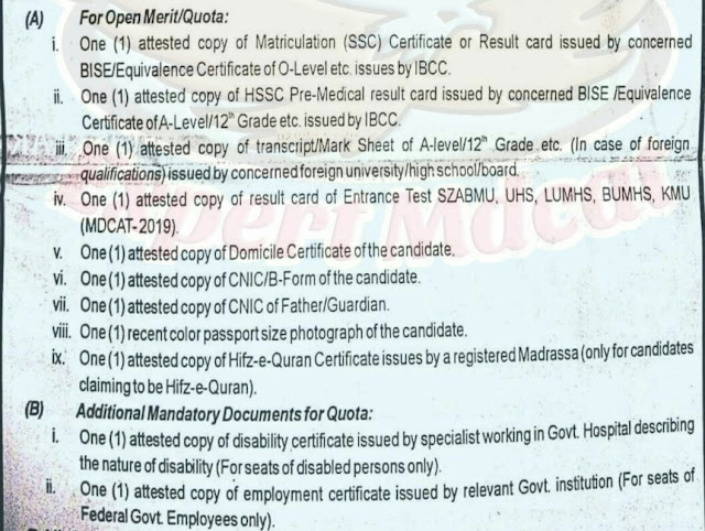To apply On Punjab Quota Seats Attested Photo Copy of Domicile &UHS Result is Mandatory. For Other Provinces ,Attested copy of Domicile and Provisional MDCAT result Copy is mandatory