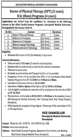 ADMISSIONS OPEN IN RAWALPINDI MEDICAL COLLEGE (DPT & AHS)