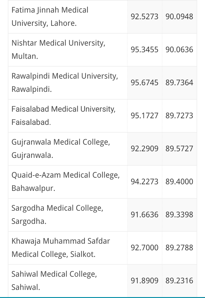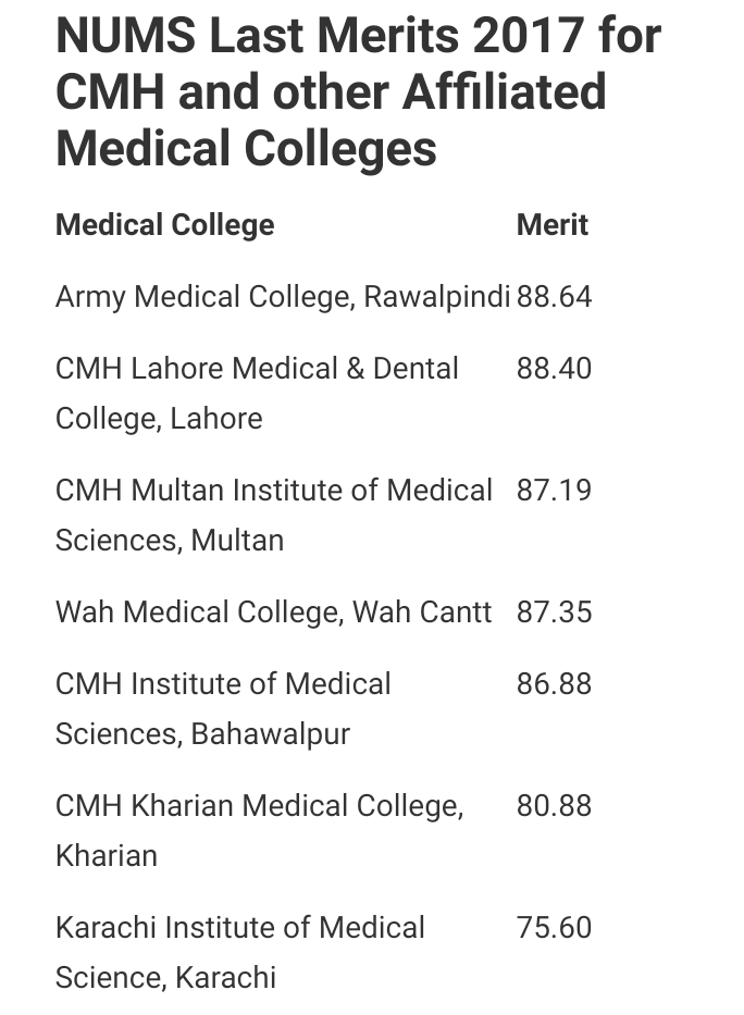 It is pleasure to provide merit list of all the medical colleges for the year 2017 conducted by UHS.it can be observed in the given pictures that there is two column of merit, one for 1st merit and another for the last merit of the respected college. Firstly, merit list affiliated colleges with UHS in the year 2017 MDCAT are given and after that, you can easily observe the NUMS affiliated colleges merit list of 2017.