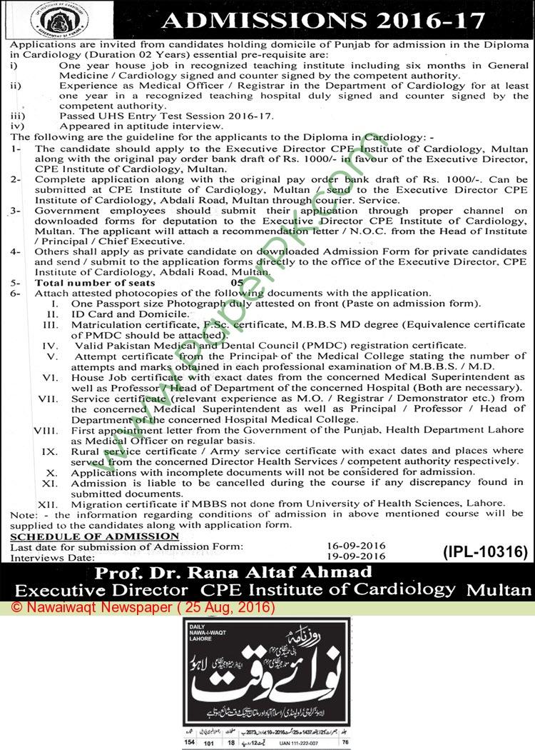 Admission Form for Diploma in Cardiology 2016-17 – Download Form